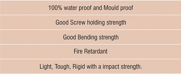 Era Gold HDF is waterproof, Termite & Borer proof, Fire retardant, Non-porous and non-corrosive Lightweight, but strong Finished, smooth & hard surface. Homogeneous High tensile strength & Impact strength It can be used for interior & exterior requirement. It can withstand any climatic conditions; It is Chemical Proof & Stain Resistant. It is 100% Recyclable and Eco friendly. It Maintenance lifetime guarantee Good thermal & sound insulation Painting not required unless desired Pure white silk glossy surface finish.